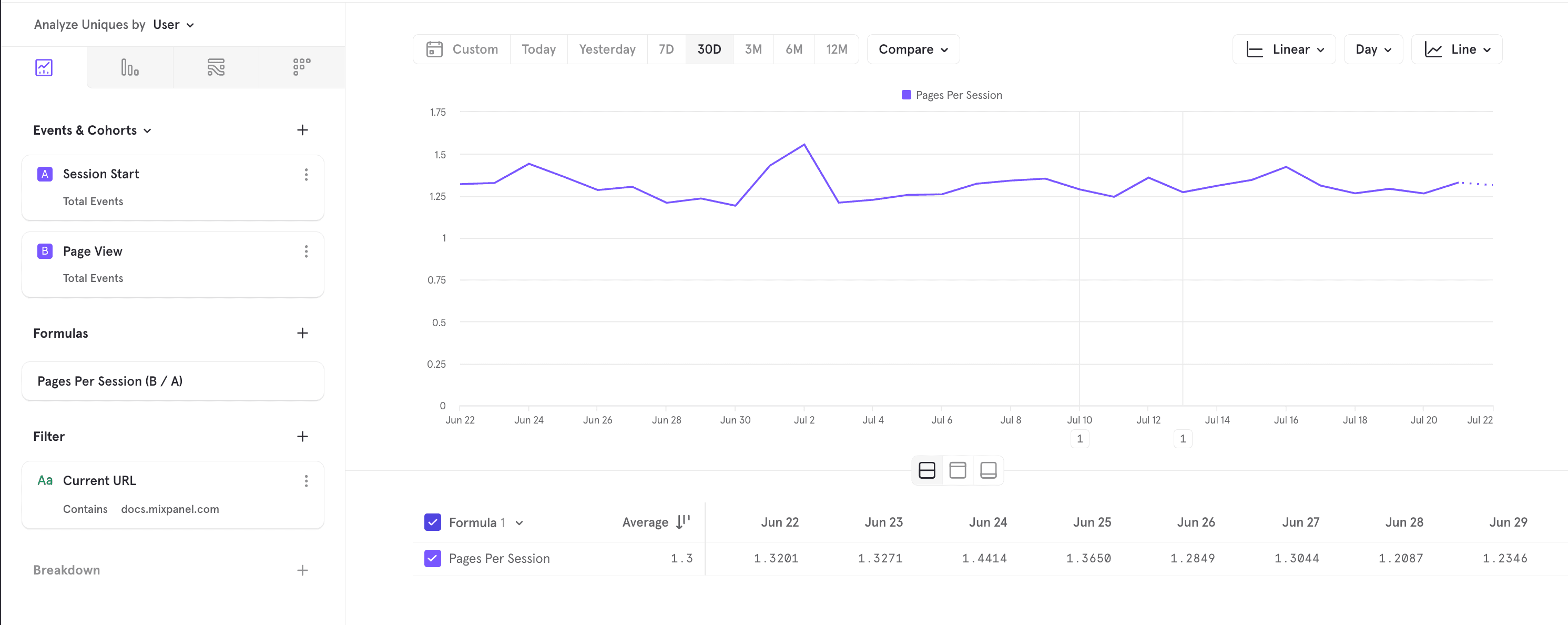 This tells us that the average number of pages per session is ~1.3 and has been fairly stable. This is fairly common due to bounces (sessions where users just see one page and quickly bounce). To filter out bounces, we can filter for sessions that are longer than 10 seconds: